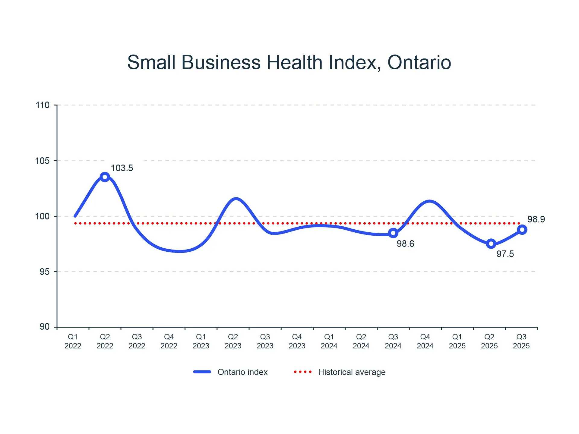 Ontario’s index rose to 98.9 in Q3 2025, a modest improvement of 1.4% quarter-over-quarter and 0.3% year-over-year.