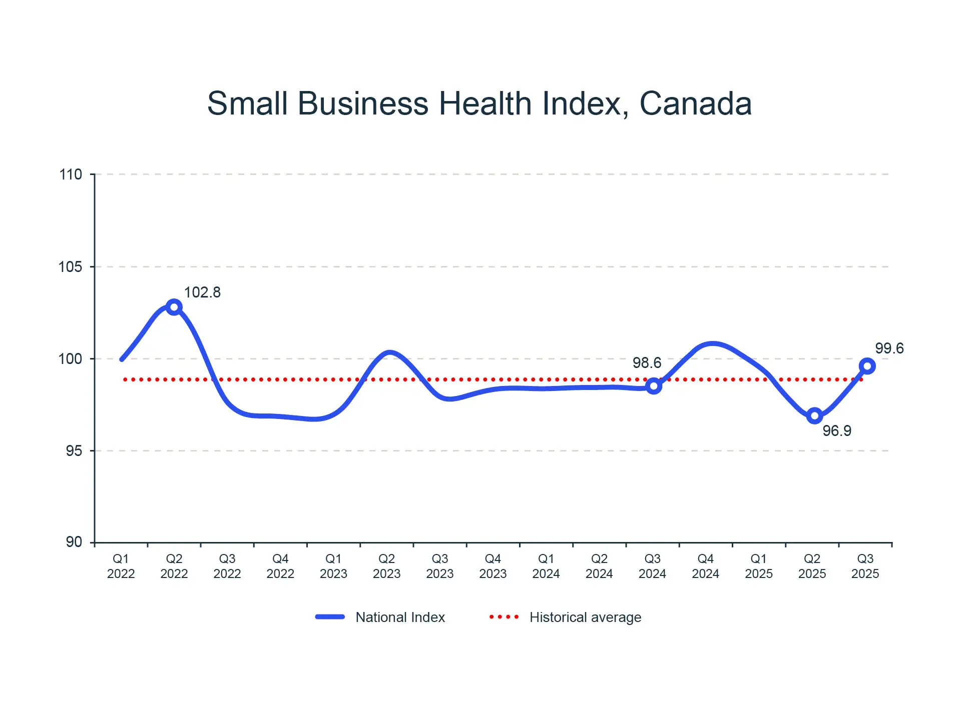 The national index climbed to 99.6 in Q3 2025, a 2.8% increase from the previous quarter. While uncertainty remained elevated, consumer fundamentals were solid—employment held up despite weakness in the manufacturing sector. The Canadian economy also showed resilience to tariffs, which helped restore some confidence among entrepreneurs.
