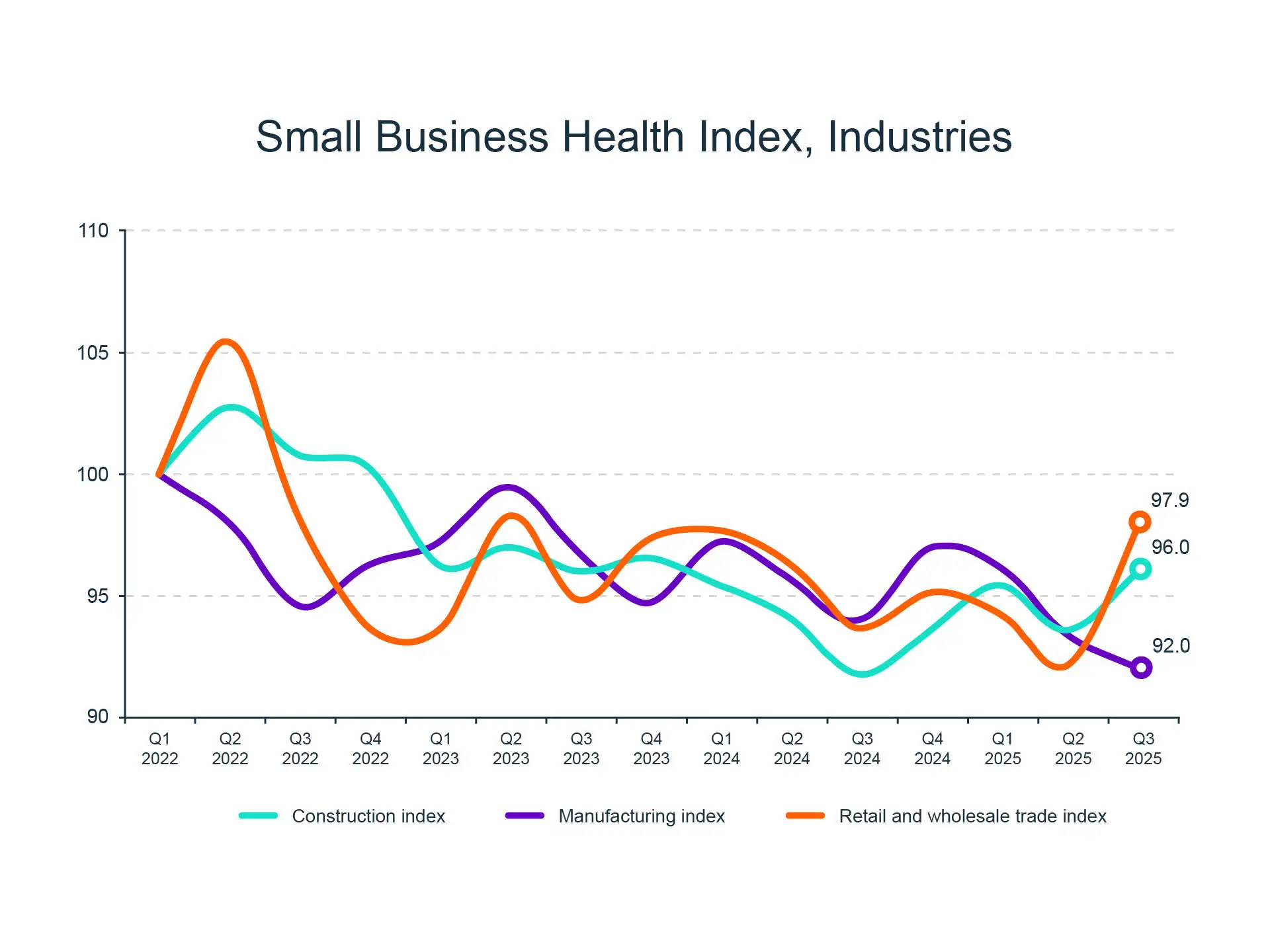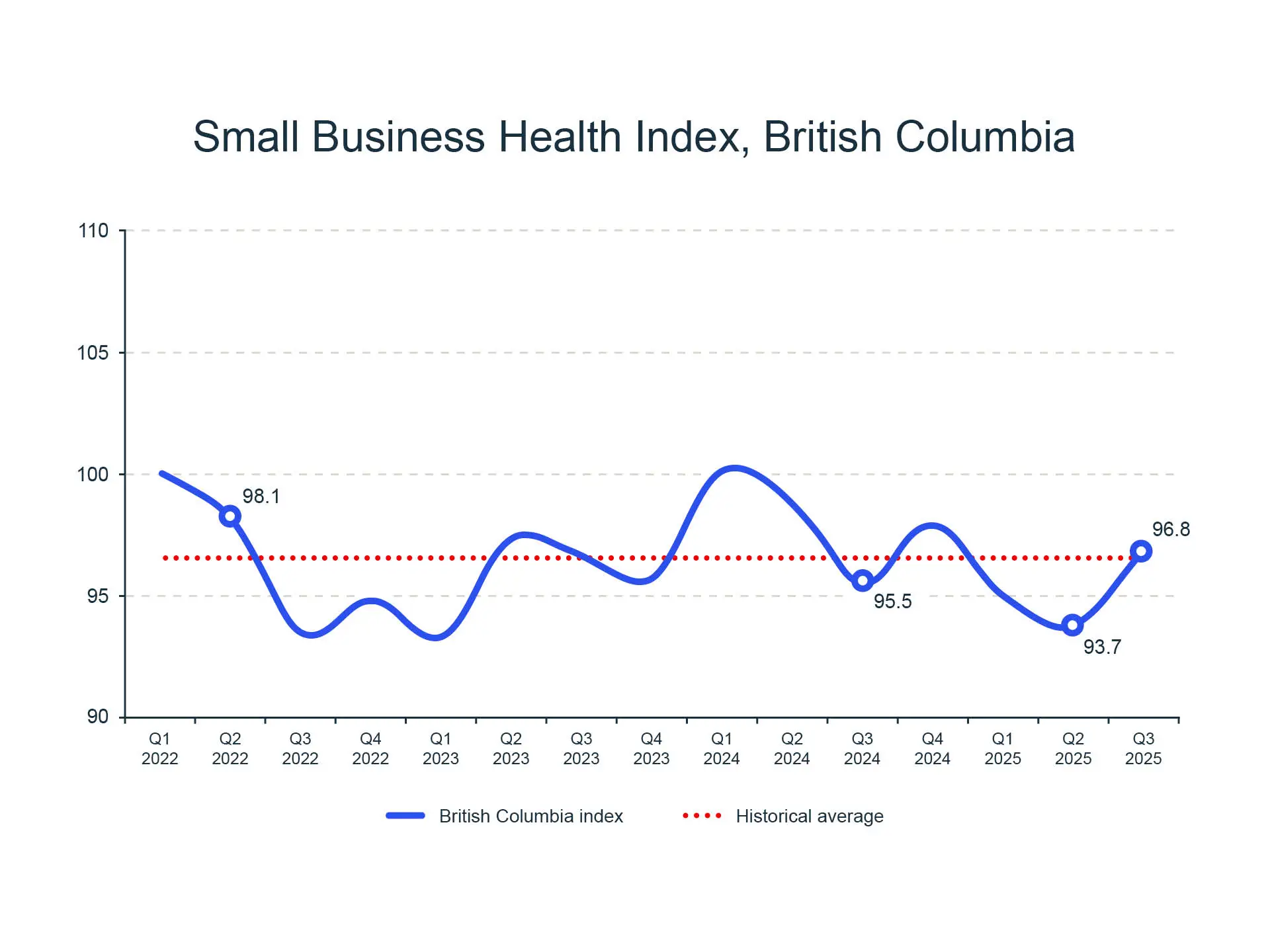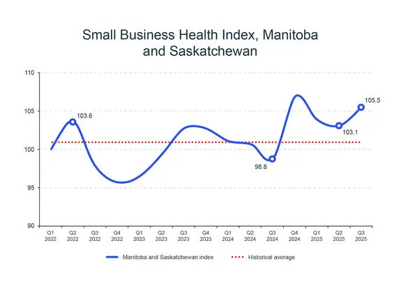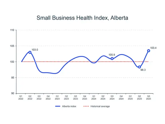 The index for Alberta rose to 103.4, a 5.2% quarter-over-quarter increase and the most significant uptick of any region in Q3 2025. This marked the highest level for the Alberta Small Business Health Index since its inception in the first quarter of 2022.
