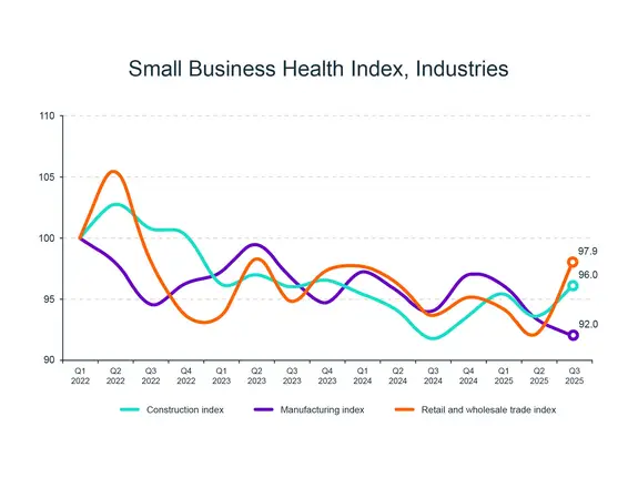 Meanwhile, the construction and retail and wholesale trade sectors all posted gains in the index. The construction index rose 2.6% quarterly and 4.6% annually. Stronger sentiment and growth projections among construction SMEs compensated for weaker employment in the sector compared to Q2 2025.
