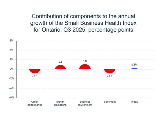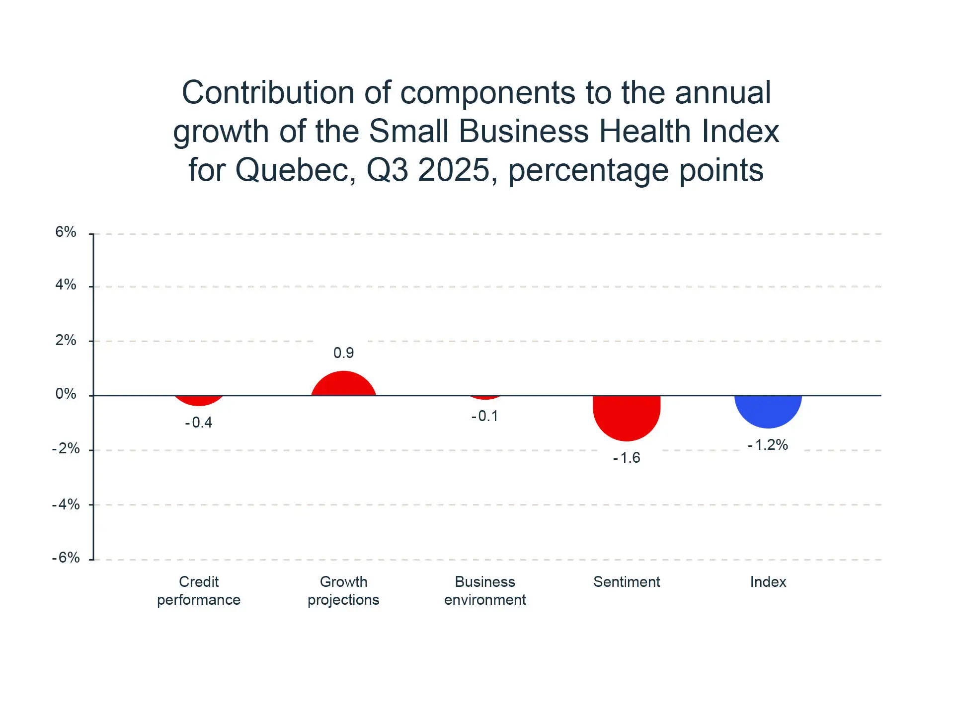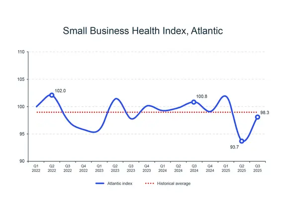 The Quebec index stood at 100 in Q3 2025, reflecting a 4.2% quarterly increase but a 1.2% decline compared to the same period last year. Quebec remains directly exposed to tariffs, particularly on aluminum and softwood lumber. While the current outlook and financial health of SMEs have improved compared to Q2 2025, when uncertainty was at its peak, they remain weaker than they were at this time last year. In short, businesses continue to face headwinds, and confidence remains tepid.