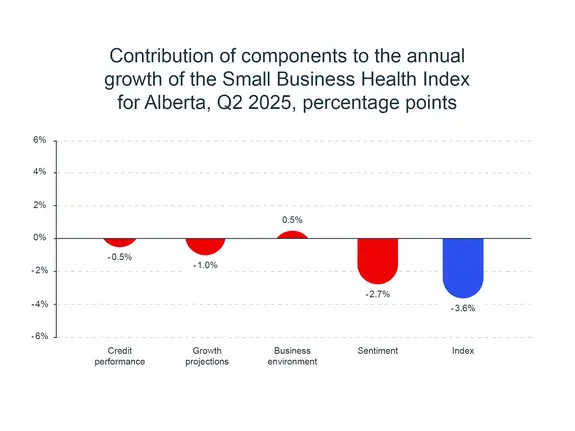 This does not account for business owners’ expectations for the future. Although confidence showed signs of improvement in the summer, Alberta’s business sentiment reached its lowest level in Q2. A 13.8% year-over-year decrease contributed to the overall decline in the index during the same period (-2.7 percentage points). Business sentiment grew more pessimistic regarding economic and cashflow outlook. Although new business openings and financing requests were stable, weaker sales, hiring and investment intentions limited growth projections. Together, these components significantly lowered Alberta’s index in Q2 2025.