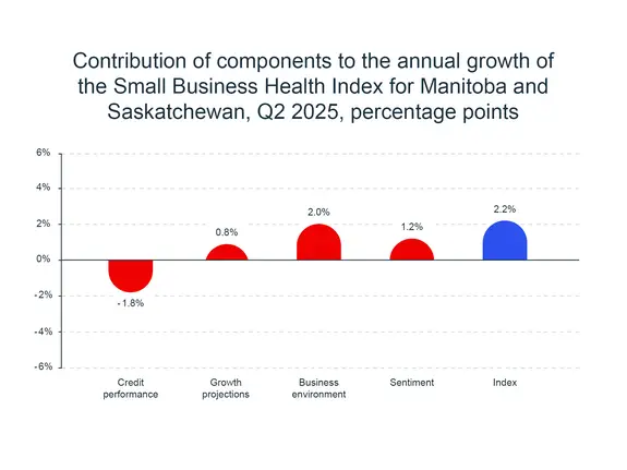 SMEs’ financial health is showing signs of improvement. The credit performance component rose 0.9% quarter-over-quarter. Loan utilization continued its declining trend quarter-over-quarter, while delinquency and insolvency rates remained stable relative to Q1 2025. In the months ahead, we can expect lower interest rates, improved sentiment and government initiatives in housing and natural resources projects to bolster small business health.