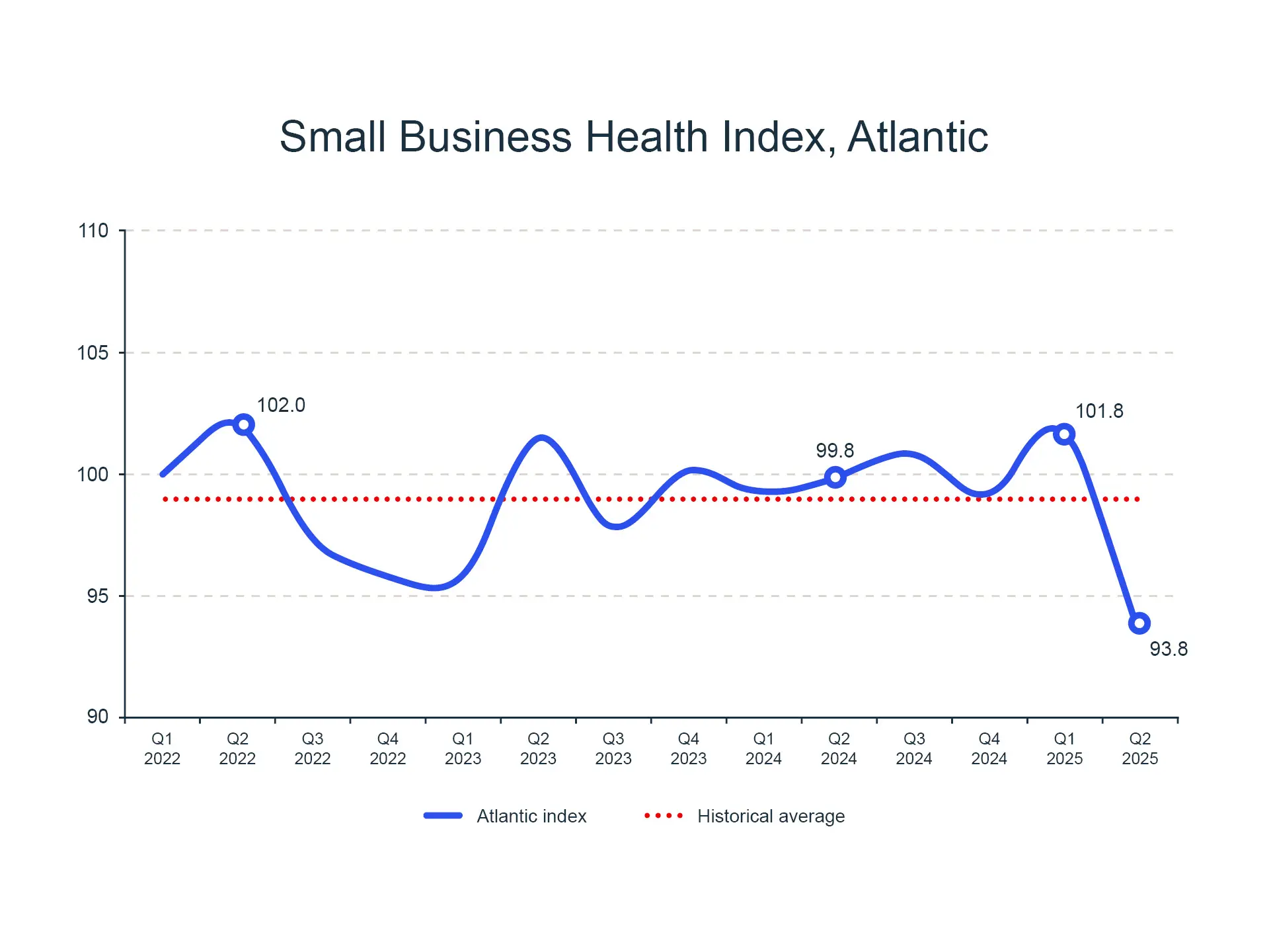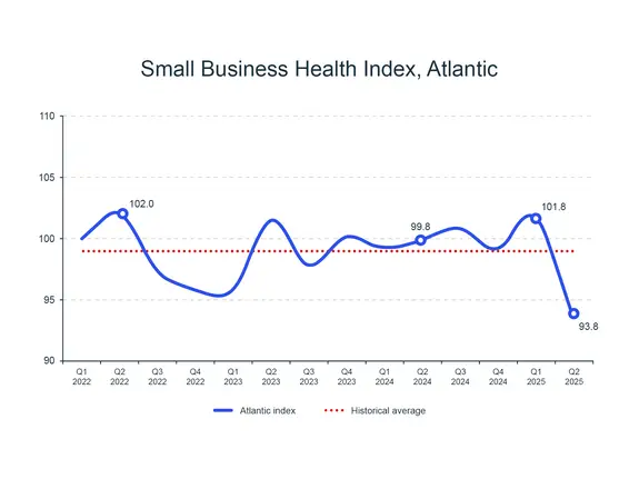 The index for the Atlantic region dropped by 7.8% in Q2, falling to 93.8, its lowest level since the index began. After a confident start to 2025, SMEs in Atlantic regions felt the weight of shifting markets.