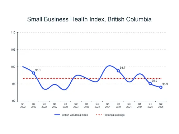 SMEs in B.C. scaled back their hiring and sales expectations over the next year in Q2 2025. While the province is less exposed to tariffs, uncertainty impacted the real estate market, with fewer housing sales in June compared to last year. Higher wages and employment boosted the business environment component this quarter, but it remained a negative influence on the index year-over-year.