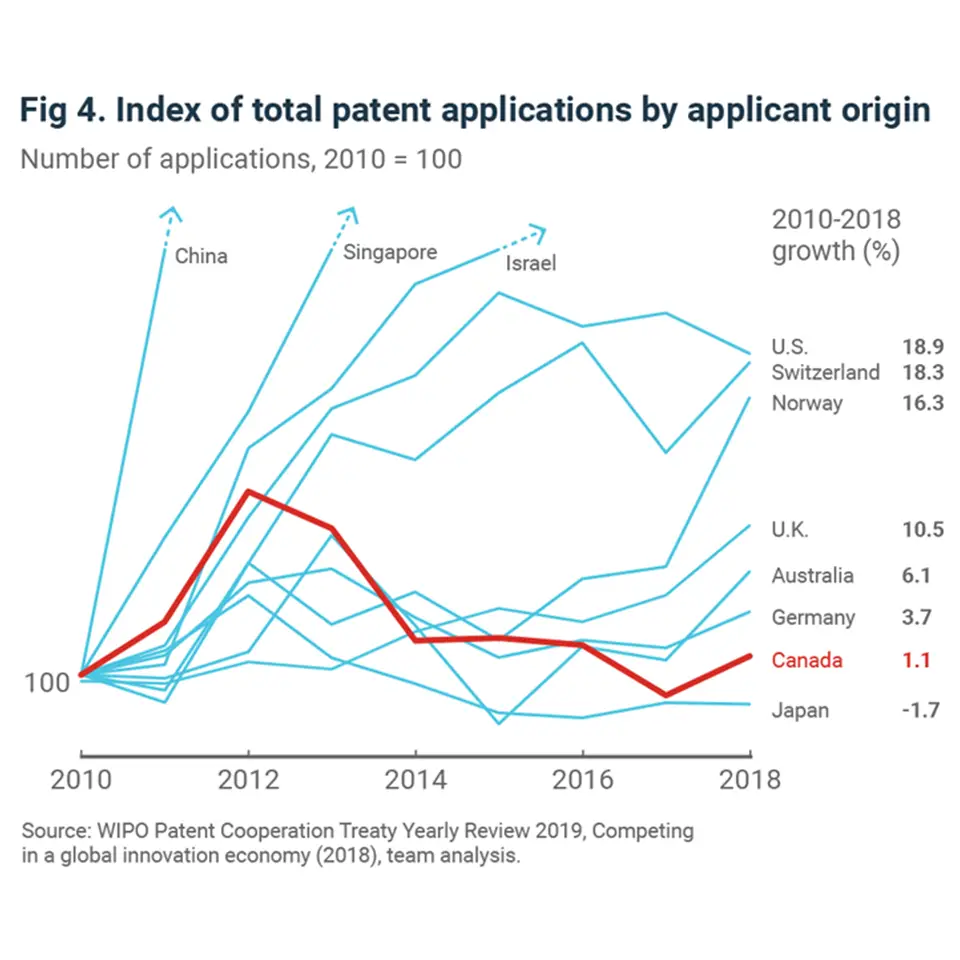 One area of worry is Canada’s lagging intellectual property production. For example, none of Canada’s top three universities (in the overall global top 50) figure in the top 50 university patent applications under the Patent Cooperation Treaty (PCT). What’s more, Canada’s annual patent output has stagnated since 2010 as compared to other leading industrialized countries (Fig. 4).