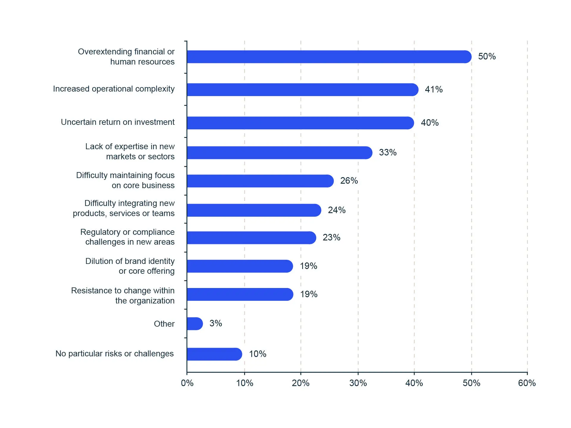 According to our survey, the main concern expressed by business owners is the risk of overextending financial or human resources. This challenge was noted by half of businesses, followed by increased operational complexity (41%) and uncertain return on investment (40%).