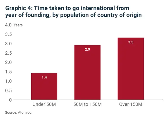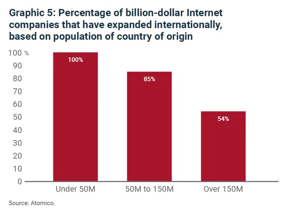 The second (graphic 5) is that of the 17 unicorns founded in countries with under 50 million people, 100% of them had an international presence, compared to just over 50% of companies founded in the largest countries.