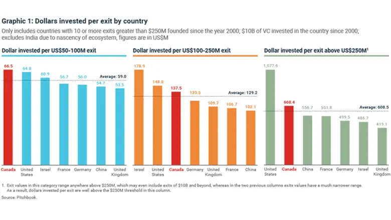 Based on these results, we can conclude that Canadian companies achieving high exit values have received as much or more capital than similar companies in other major ecosystems, with the exception of those in the U.S.