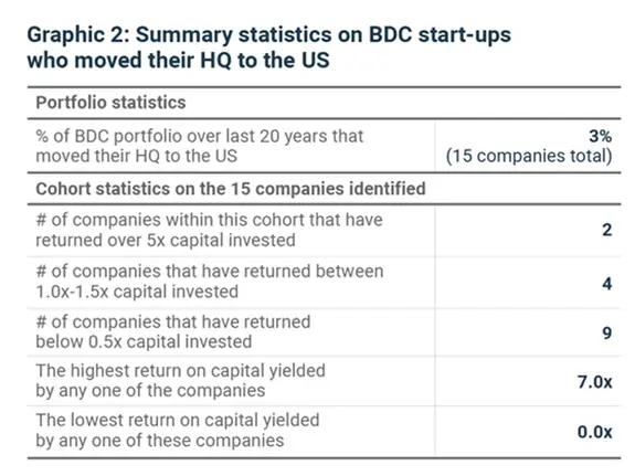 From our portfolio over the last 20 years, we found only 15 companies that now say their HQ is in the U.S., a modest 3% of the total. The next question is to investigate whether this small cohort performed materially better than the much larger cohort of companies that remained in Canada. Below is a table summarizing the performance of this cohort: