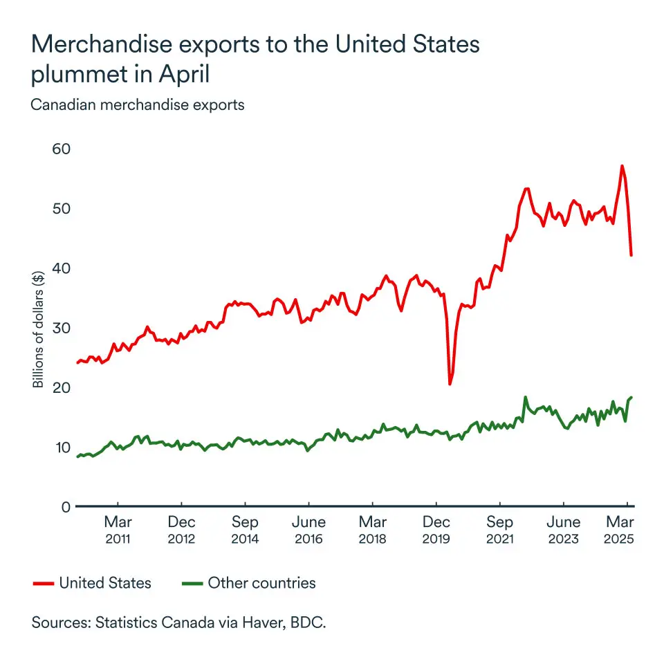In fact, Canadian exports to the U.S. have already slowed significantly—falling by over 15% in April. By contrast, exports to the rest of the world rose by 2.9%, but this wasn’t enough to maintain overall trade growth.