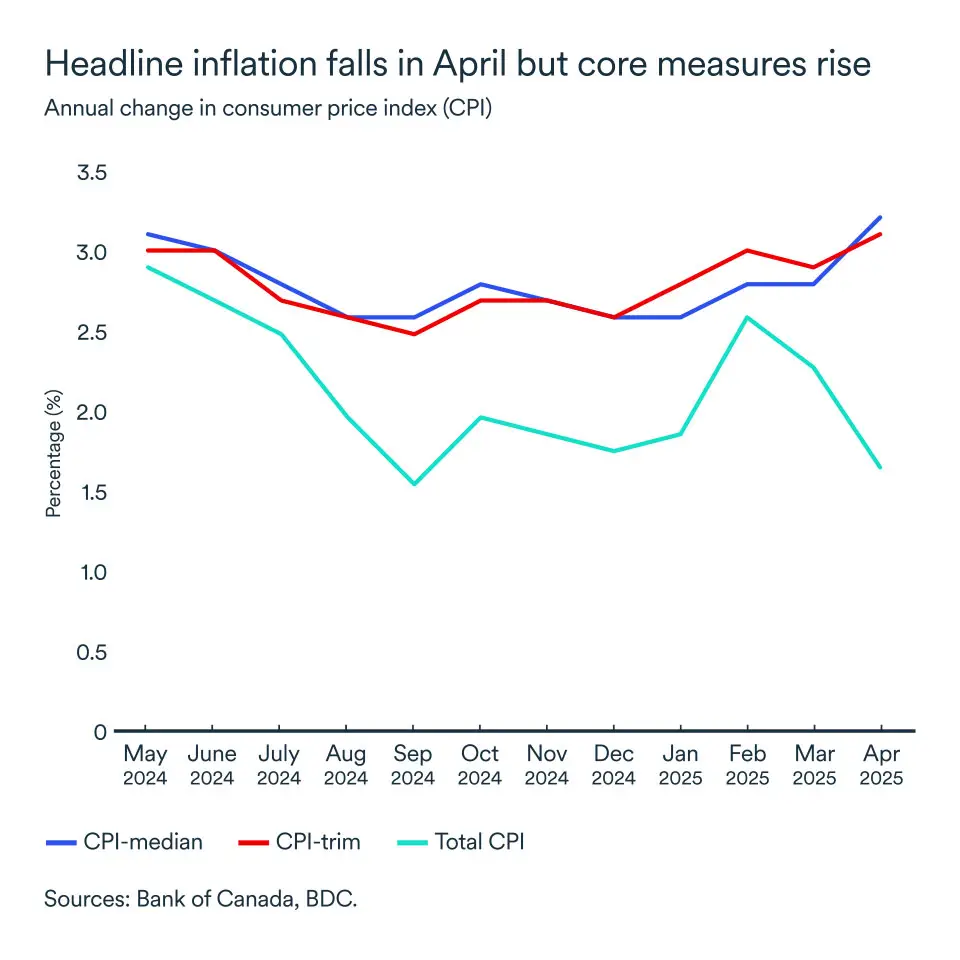 The Bank of Canada maintained its key rate at 2.75% in its June 4 announcement. Headline inflation, as measured by the annual change in the consumer price index, slowed to 1.7% in April. But core inflation measures, which the Bank of Canada favours, picked up again, all exceeding 3%.