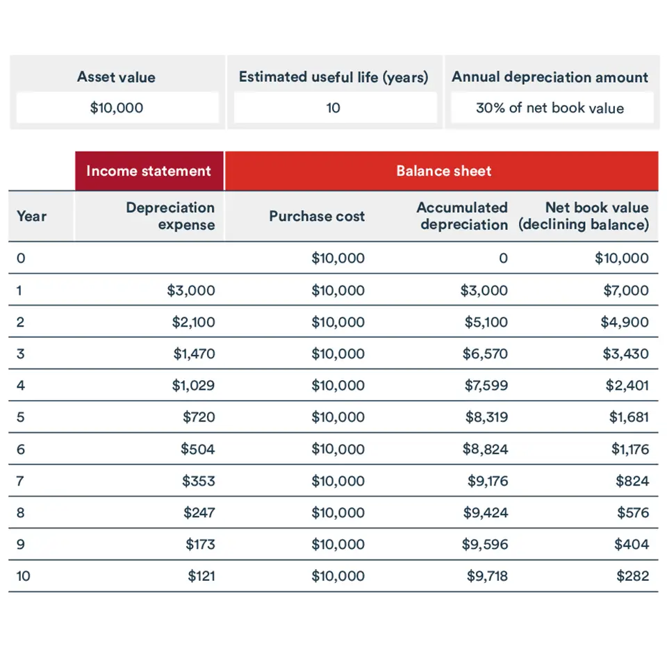 The second method is called the declining balance method. It is used for assets such as laptops or vehicles that lose much of their value early on. The amount amortized each year gets smaller as the total value of the laptop is reduced: