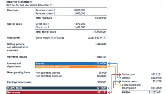 EBITDA is calculated with the following formula, using elements found in the income statement.