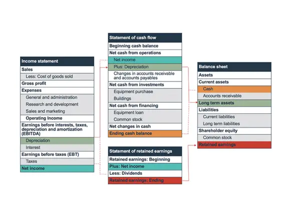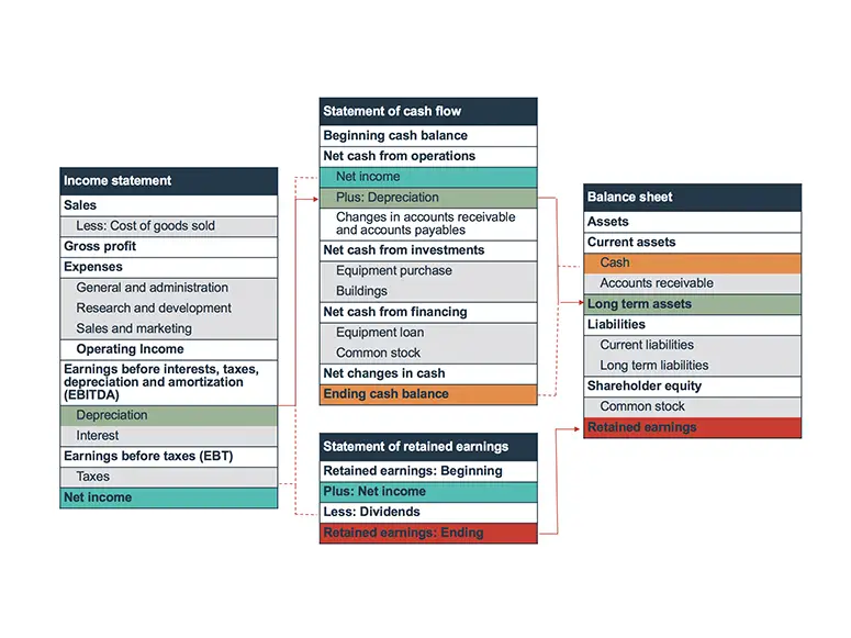 All four financial statements are linked. For example, net income is recorded at the bottom of the income statement (see below). It is also found on the cash flow statement and statement of retained earnings. After dividends are subtracted, we get retained earnings, which are stated on the balance sheet.