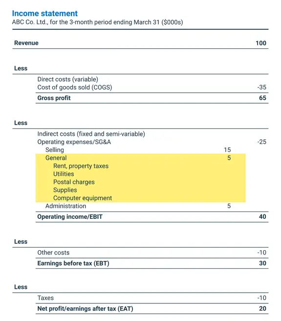 The graphic below shows where general expenses appear on a company’s income statement and how they are used to calculate total costs, and earnings before interest and taxes.