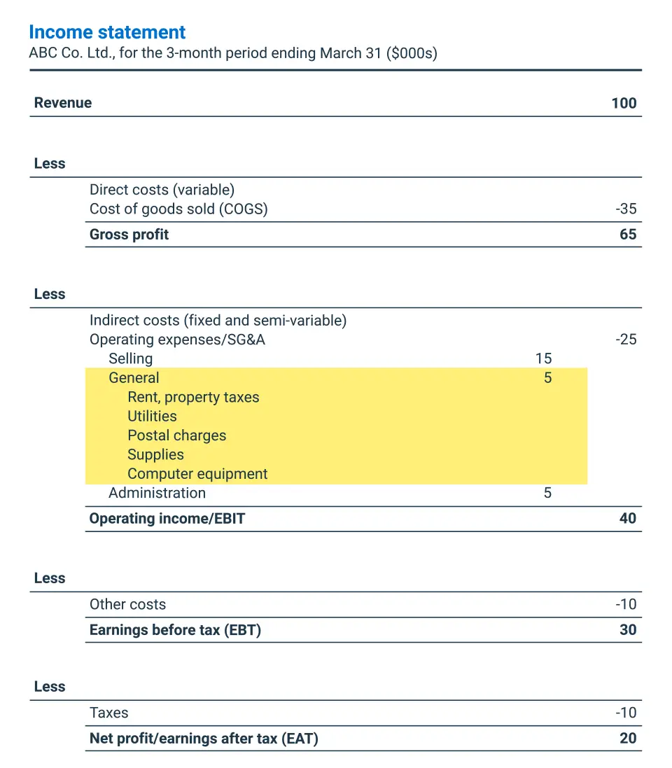 “General expenses are directly related to the operation of the business,” says Alex Barros, Business Advisor with BDC Advisory Services in Edmonton. “Rent, insurance, utilities, office supplies—all of the costs associated with the day-to-day running of the business. They are also called overhead.”