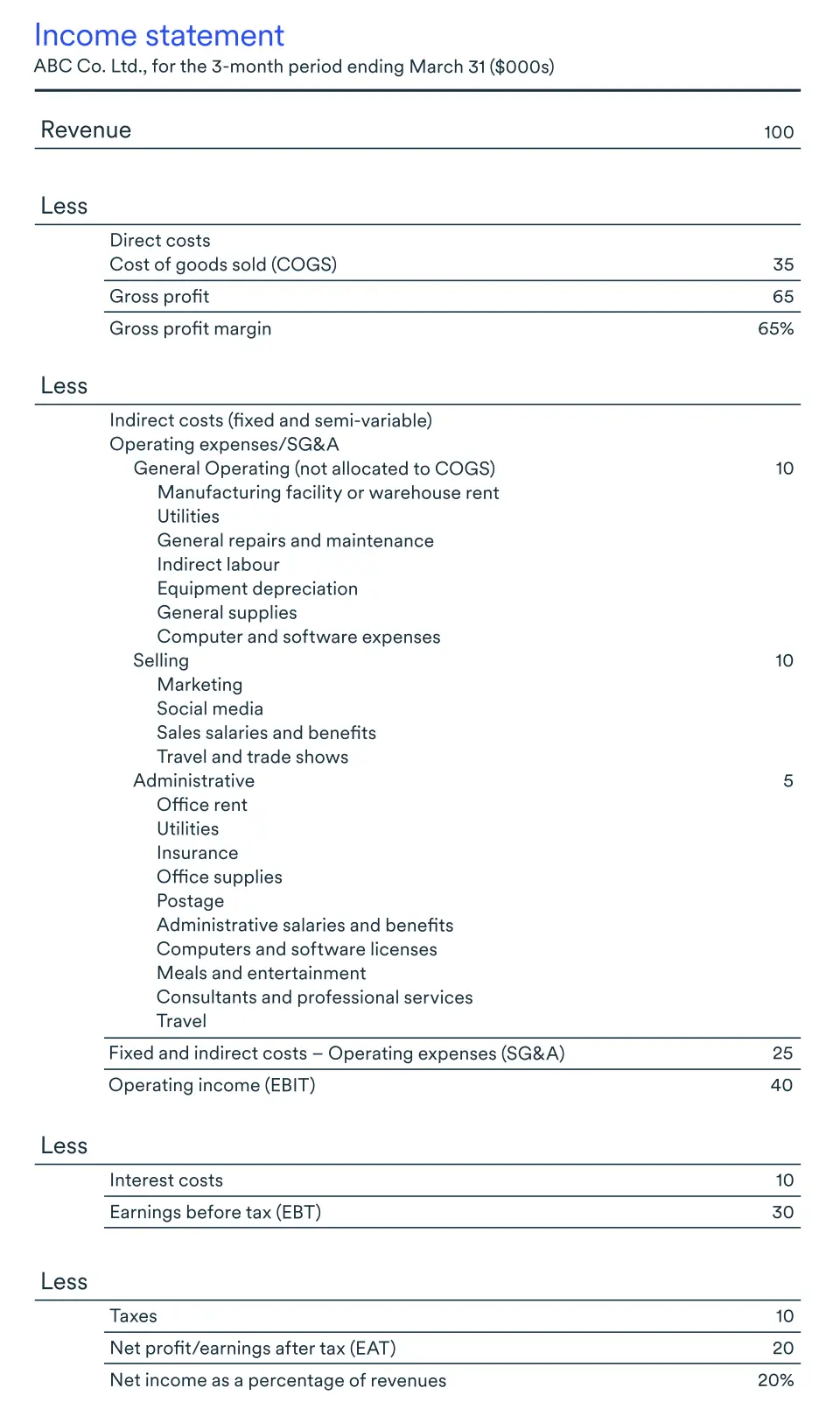 In this case, ABC Company manufactures a single product. The selling, general and administrative expenses to go to market are $10,000, $10,000 and $5,000, respectively.