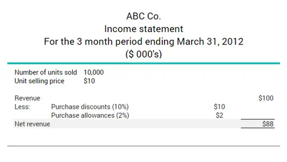 The excerpt below shows how net revenue appears on the income statement of a retail or wholesale company. In this case, ABC Co. sells 10,000 units of its product at $10 each, with a 10% purchase discount and a 2% purchase allowance for customers.