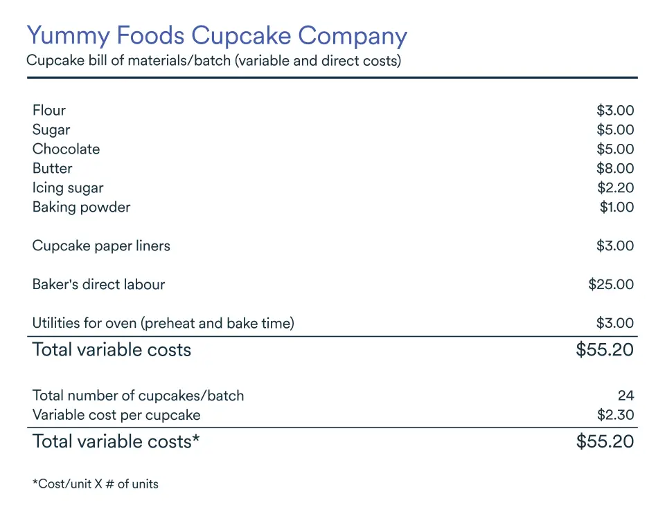 For a company that makes cupcakes, variable costs would include raw material like flour and sugar, labour costs, utilities and cooking supplies.