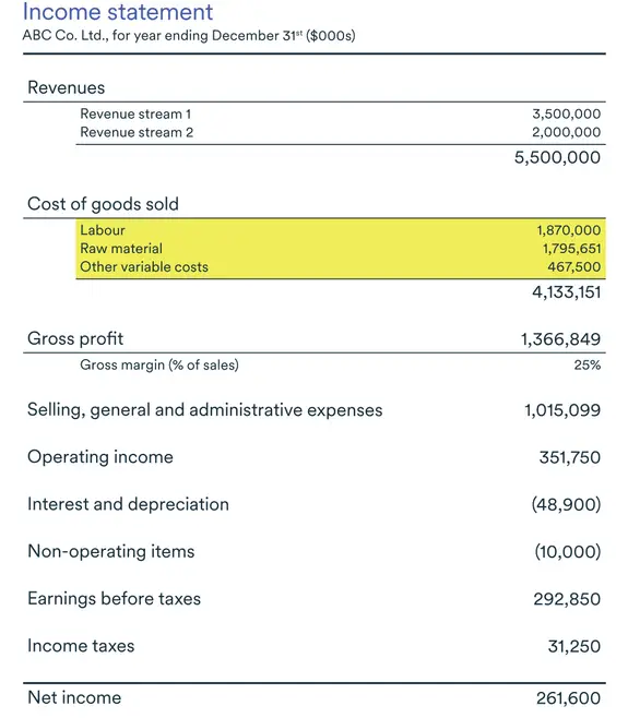 Variable costs generally appear on an income statement under cost of goods sold (COGS) or cost of sales, as highlighted in the image below.