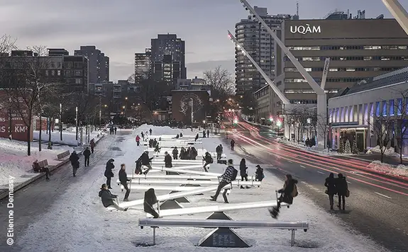 The quirky seesaws his team had designed for Montreal’s downtown festival district had been an instant hit with kids and adults alike. The 30 seesaws light up and emit sounds in unison to create a playful symphony as people go up and down.