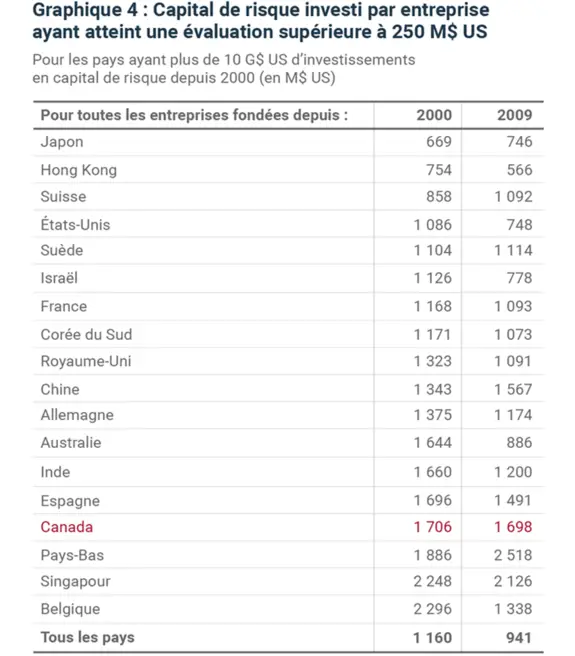 Qui plus est, l’efficacité de notre écosystème de capital de risque serait de calibre mondial. Lorsque nous utilisons un point de référence de plus de 50 millions de dollars américains pour les retraits, nous sommes presque 60 % plus efficaces que les États-Unis. Seuls Israël et la France sont plus efficaces.