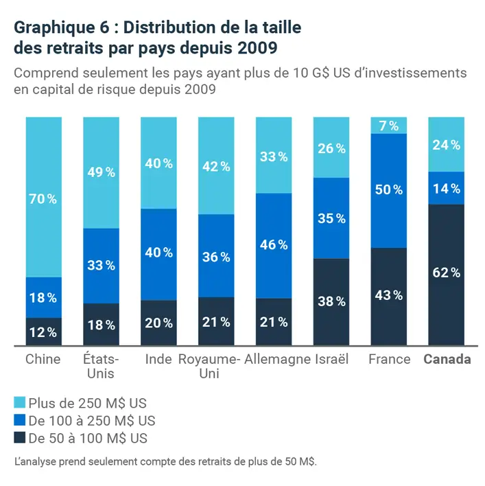 Nous constatons que si les méga-écosystèmes du capital de risque de la Chine et des États-Unis présentent un nombre nettement plus élevé de retraits supérieurs à 250 millions de dollars américains, l’inverse est vrai pour le Canada, où les retraits se situent principalement dans la fourchette de 50 à 100 millions de dollars américains.