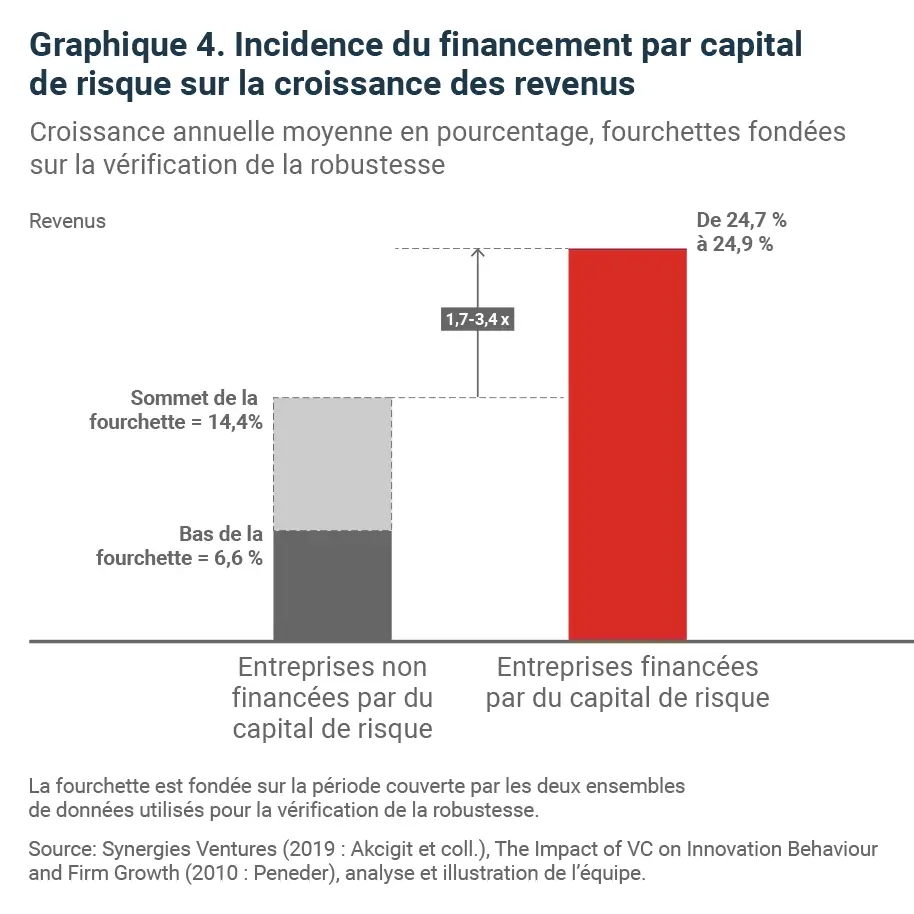 Pour ce qui est des revenus, le soutien en capital de risque est associé à une croissance annuelle des revenus jusqu’à 3,4 fois supérieure à la moyenne (graphique 4).