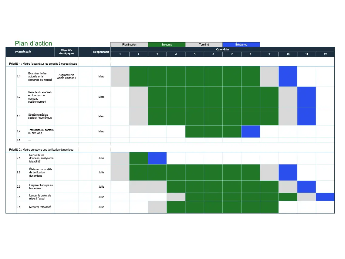 Les mesures déterminées comme étant prioritaires seront finalement intégrées dans un plan d’action qui comprendra un calendrier, la prise en charge de chaque initiative et une estimation des coûts. Voici un exemple de ce à quoi peut ressembler un plan d’action pour votre entreprise.