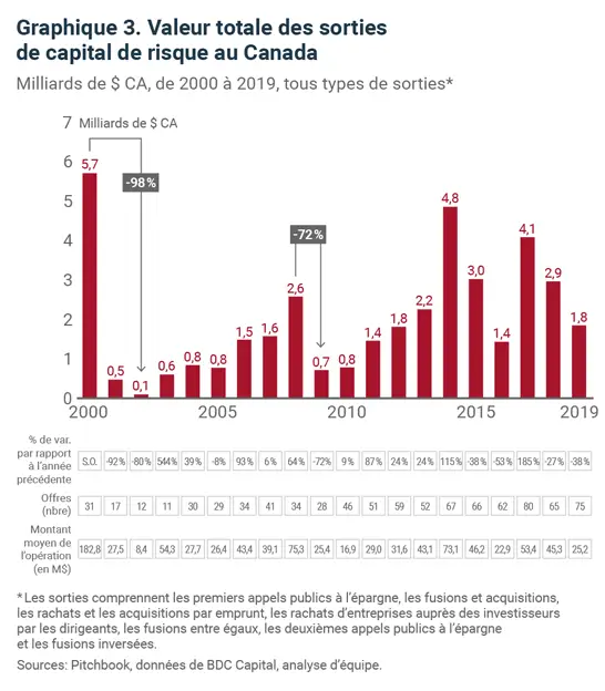 Les résultats de sortie des sociétés de capital de risque canadiennes se sont considérablement améliorés ces dernières années. La taille médiane des sorties au Canada a été multipliée par 3,8 entre 2016 et 2019. En ce qui concerne le délai de sortie par rapport au premier financement, le Canada a atteint la parité avec les États-Unis en présentant un résultat de 6,1 ans au cours de la même période.