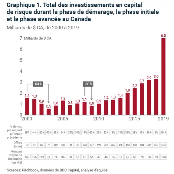 La récession du début des années 2000 et la crise financière de 2007-2009 ont entraîné un net recul des investissements en capital de risque, qui s’est exprimé par des réductions de 30 % à 64 % sur deux à quatre ans. Une chute similaire des investissements serait un revers pour le secteur canadien, qui a connu une année 2019 exceptionnelle. Les 6,5 milliards de dollars d’investissements en 2019 en ont fait de loin la meilleure année jamais enregistrée (graphique 1).