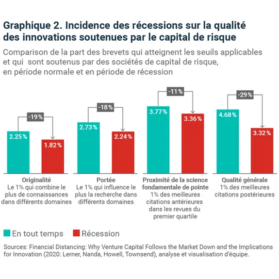 Une analyse de la qualité des brevets démontre qu’en période de récession, les investisseuses et investisseurs en capital de risque ont tendance à soutenir les entreprises qui font preuve de moins d’originalité et ont moins d’influence sur leur secteur et une moins grande proximité avec la science fondamentale. Dans l’ensemble, les recherches démontrent que la qualité générale des innovations des entreprises financées par du capital de risque chute de 29 % lors des récessions (graphique 2).