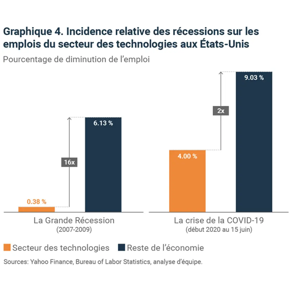 Jusqu’à présent, le secteur des technologies demeure vigoureux durant la pandémie, ce qui constitue un élément positif. Par exemple, l’indice NASDAQ, qui regroupe une forte proportion de sociétés du secteur de la technologie, a dépassé les autres indices boursiers américains. En outre, l’emploi dans le secteur des technologies a su bien résister à la crise de la COVID-19 comme à la Grande Récession de 2007-2009. La croissance rapide du secteur et son importance économique devraient inciter les investisseuses et investisseurs à se projeter dans le long terme (graphique 4).