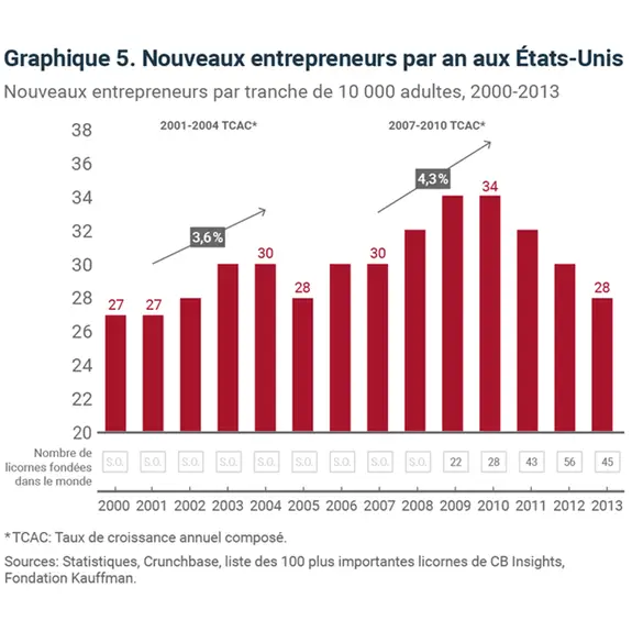 Les périodes de récession et la phase initiale des reprises sont associées à la création d’un grand nombre d’entreprises (graphique 5). Des entreprises de grande influence, telles que LinkedIn, Tesla, Facebook et Shopify, ont toutes été lancées dans le sillage de l’éclatement de la bulle Internet. Airbnb, Uber, Slack et Stripe ont toutes démarré pendant la Grande Récession de 2007-2009.