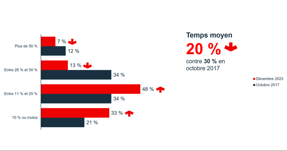 Le temps consacré à la gestion financière a diminué de façon assez fulgurante. Les propriétaires d’entreprise y passent 20 % de leur temps. C’était auparavant 30 % de leur temps. Notre hypothèse est que les propriétaires d’entreprise ont eu moins de temps pour les questions financières, entre autres à cause des défis des dernières années, comme la pandémie, les pénuries de main-d’œuvre et les problèmes de chaînes d’approvisionnement.