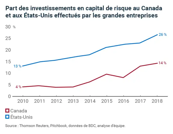 Avant la pandémie, les investissements en capital de risque au Canada étaient en expansion et occupaient une part de plus en plus importante dans l’écosystème. Les investissements des grandes entreprises ont tendance à être cycliques; nous ne pouvons pas être certains des effets de la crise, mais il y a un risque que celles-ci freinent leurs investissements.