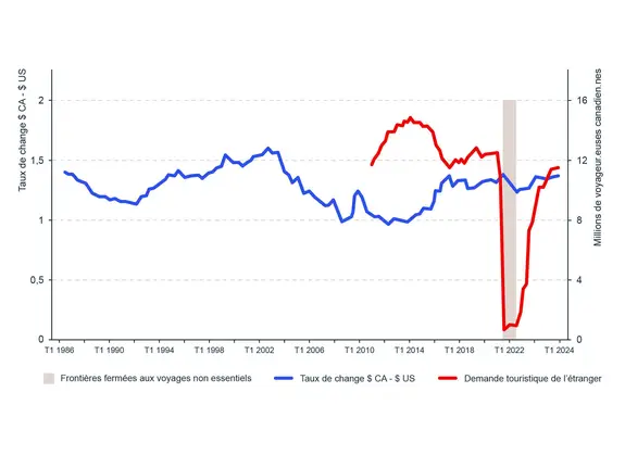 Graphique 5: Lien entre la demande touristique de l’étranger et le taux de change $ CA-$ US, entre 1986 et 2024