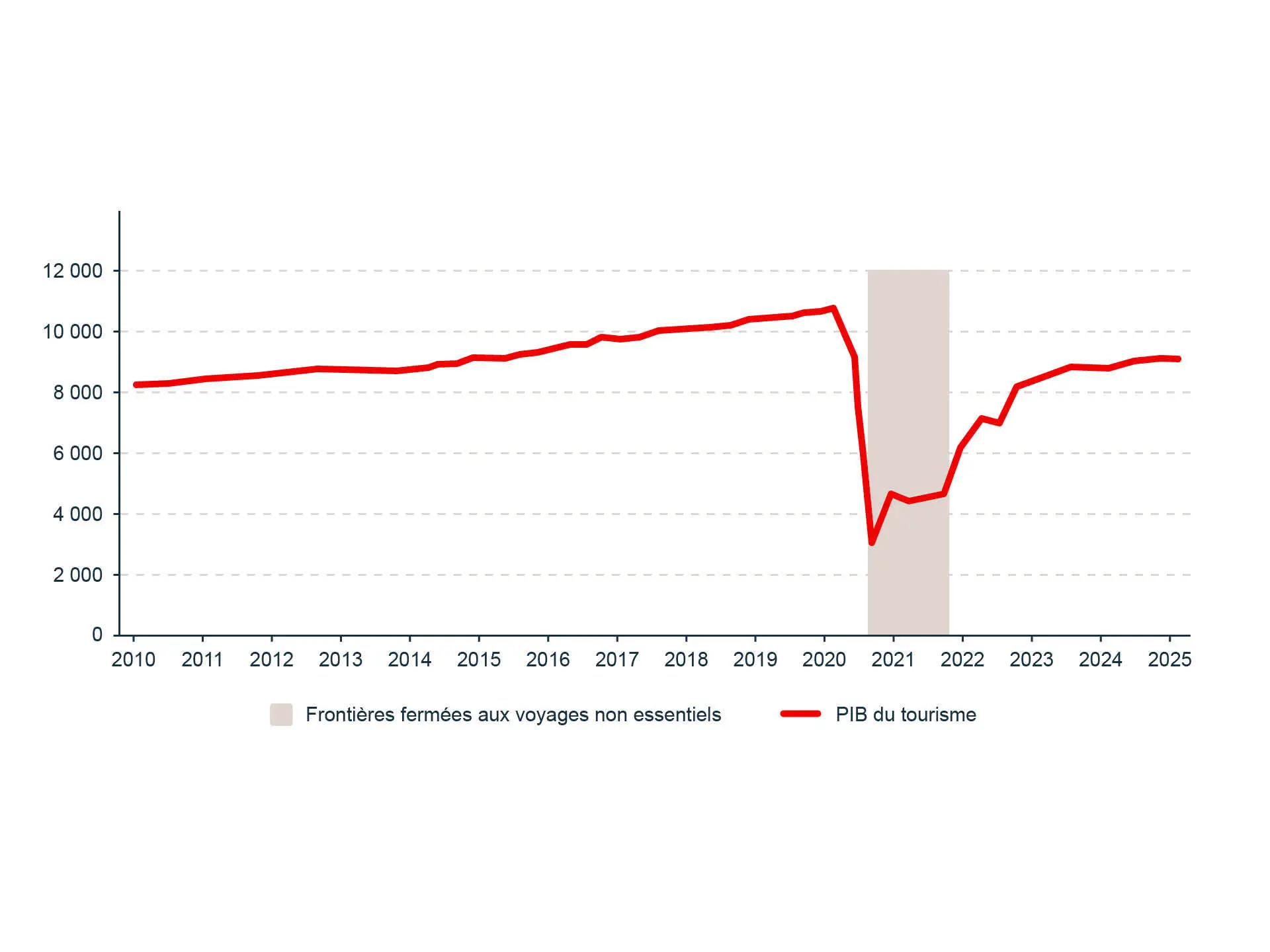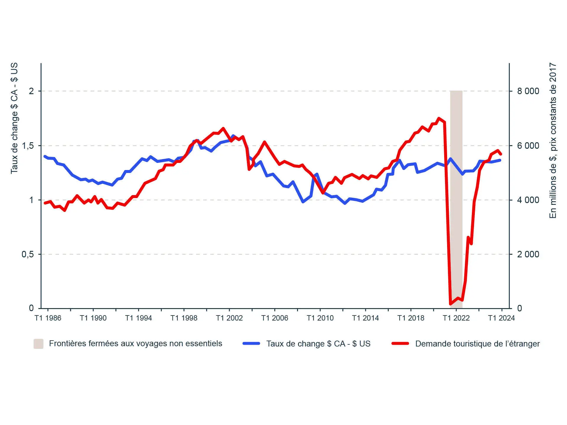 Sources: Statistique Canada. Tableau 36-10-0230-01 Demande touristique au Canada, prix constants (x 1 000 000); Banque du Canada