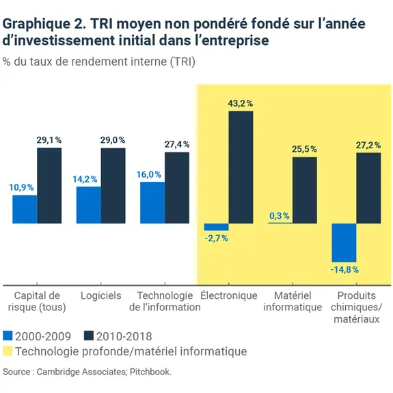 Parallèlement, le rendement dans le secteur des technologies profondes a également considérablement progressé depuis 2010 (graphique 2). Alors que, de 2000 à 2009, les investissements dans les technologies profondes et le matériel accusaient un retard par rapport à l’ensemble de la catégorie d’actifs de capital de risque, ils les ont depuis surpassés ou ont enregistré un rendement équivalent.