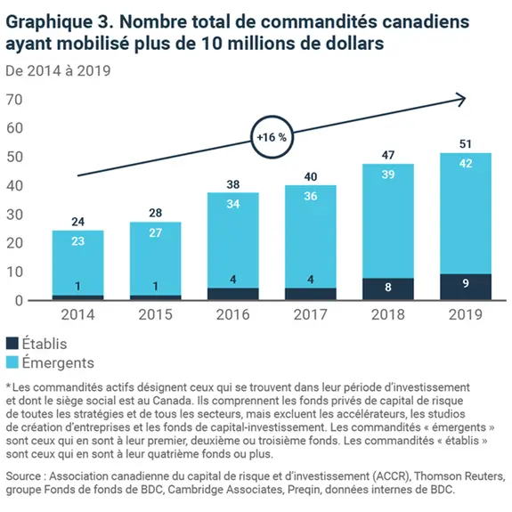L’écosystème canadien du capital de risque a été renforcé par la diversité croissante et le rendement plus élevé des commandités et commanditées. Le nombre d'effectifs en exercice a doublé depuis 2014, avec l’arrivée de plusieurs franchises de fonds. La part qu’on considère établie – c’est-à-dire qui a lancé au moins son quatrième fonds – est passée de 4 % à 18 % au cours de la même période, autre indicateur de la maturité croissante de l’écosystème du capital de risque (graphique 3).