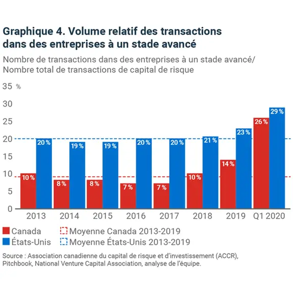 Au Canada, la proportion des transactions de capital de risque à un stade avancé a nettement augmenté depuis 2017. Cela signifie que les entreprises technologiques canadiennes établies bénéficient d’un soutien accru pour leurs ambitions de croissance, au pays et à l’étranger. La part des investissements canadiens en capital de risque dans des entreprises à un stade avancé rivalise désormais en nombre avec celle des États-Unis (graphique 4). Toutefois, en valeur globale, le Canada demeure derrière les États-Unis (graphique 5).