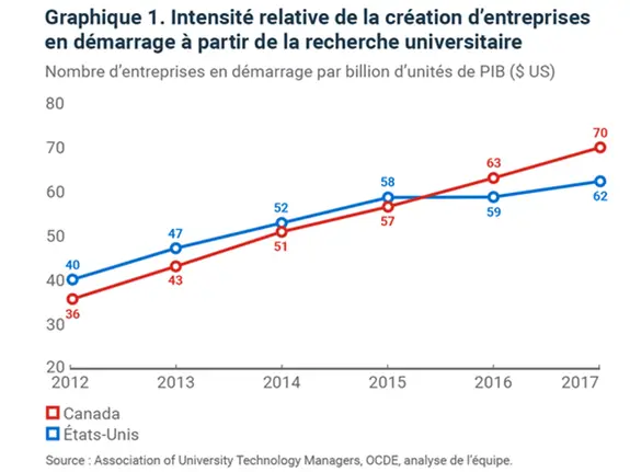 Le Canada est devenu un territoire fertile pour la commercialisation de la recherche universitaire. Le Canada compte des universités de premier ordre qui accueillent une énorme population étudiante diversifiée et un nombre élevé de pépinières d’entreprises de premier plan. Cela a conduit le Canada à dépasser les États-Unis, depuis 2016, en ce qui concerne la conversion de la recherche universitaire en nouvelles entreprises en démarrage (graphique 1).
