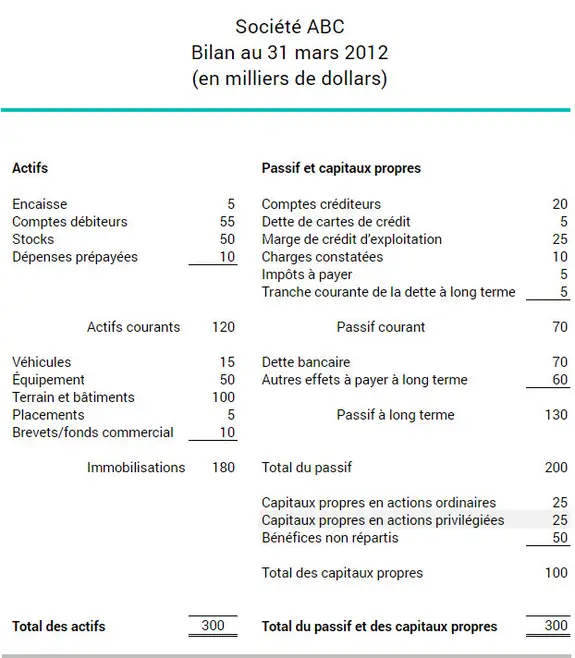 L’exemple de bilan ci-dessous montre que les actions privilégiées et les actions ordinaires figurent à titre de capitaux propres.