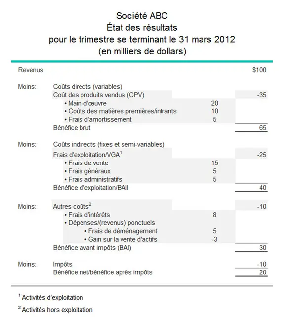 L’exemple d’état des résultats ci-dessous montre comment on comptabilise les activités d’exploitation et hors exploitation.