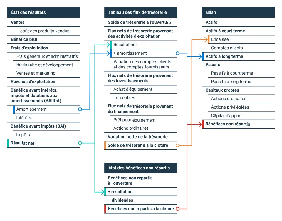 Par exemple, supposons que votre entreprise dégage un résultat net positif après impôt au cours d’un exercice. Il est d’abord inscrit comme résultat net dans l’état des résultats. Le résultat net est représenté à la fois dans le tableau des flux de trésorerie et dans l’état des bénéfices non répartis. Après déduction des dividendes, les bénéfices non répartis de l’exercice courant sont présentés au dernier poste de l’état des bénéfices non répartis ainsi qu’à la section des capitaux propres du bilan.