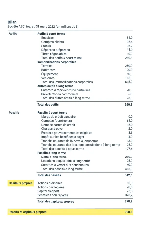 Dans le bilan ci-dessous, les capitaux propres sont présentés dans une section distincte et répartis entre les quatre catégories. Lorsqu’ils sont ajoutés au passif, la somme obtenue est égale à la valeur des actifs de l’entreprise.