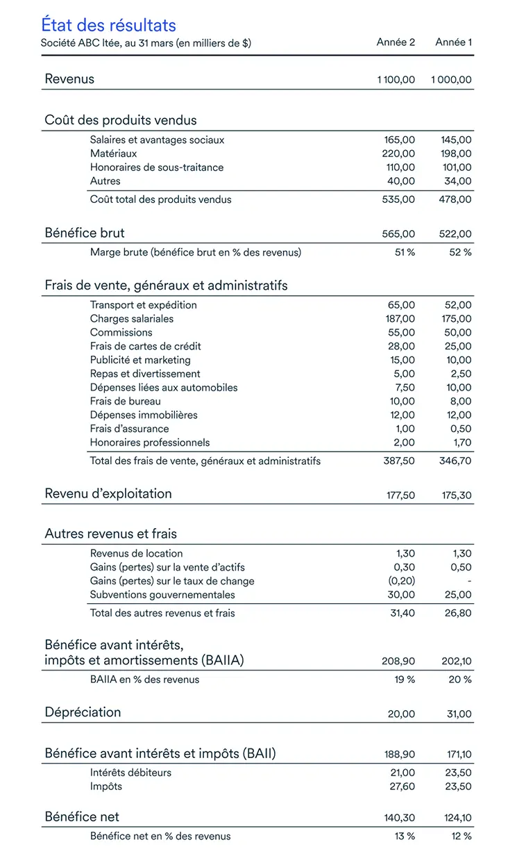 Dans l’état des résultats ci-dessous, le CPV de la Société ABC ltée était de 535 000 $ en 2022 et de 478 000 $ en 2021.