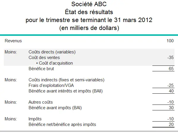 L’état des résultats en exemple ci-dessous démontre le coût des ventes pour un commerce de détail/de gros qui achète 10 000 unités d’un seul produit 3,50 $ chacune et les revend 10 $ l’unité.