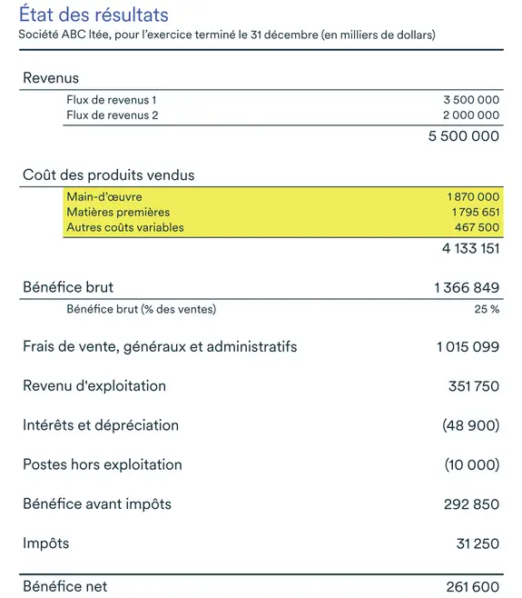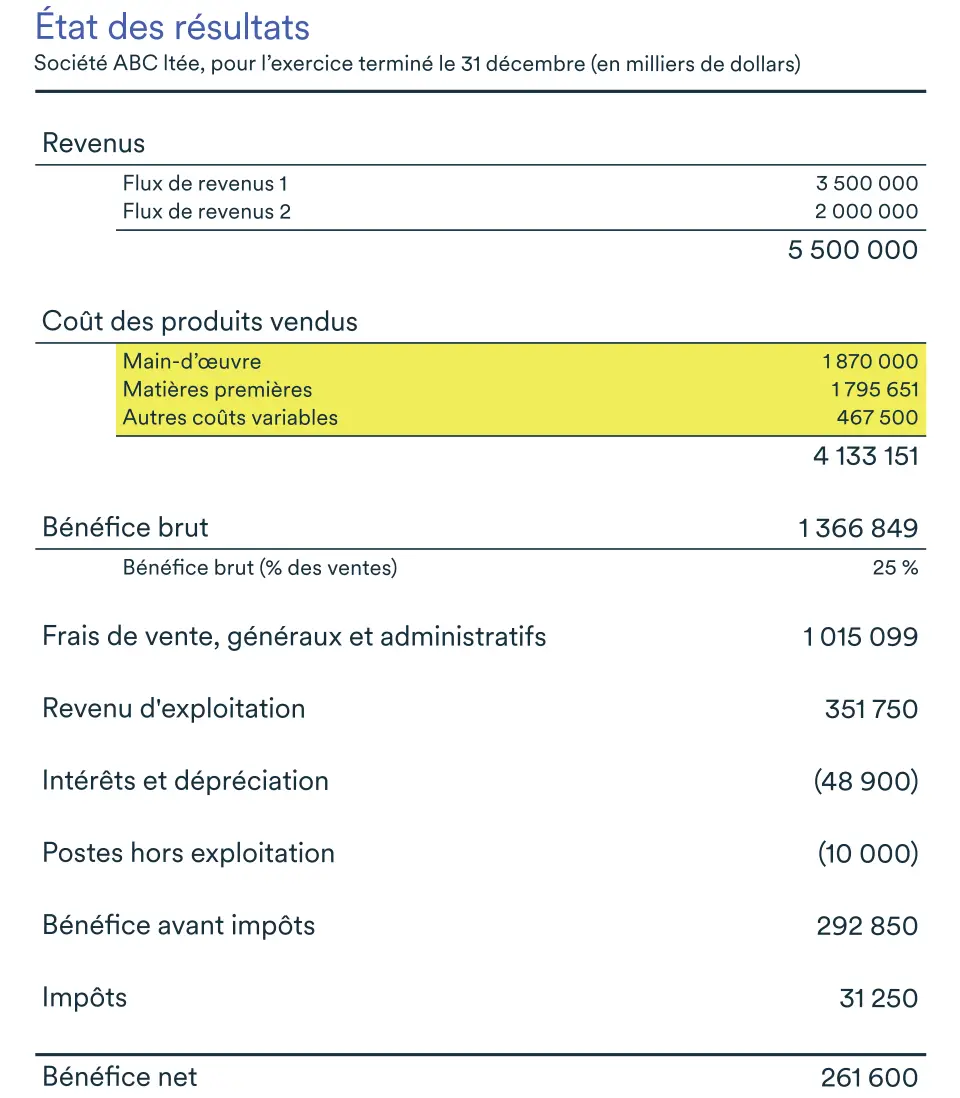 Ces trois types de coûts (variables, semi-variables et fixes) figurent également différemment dans l’état des résultats d’une entreprise.